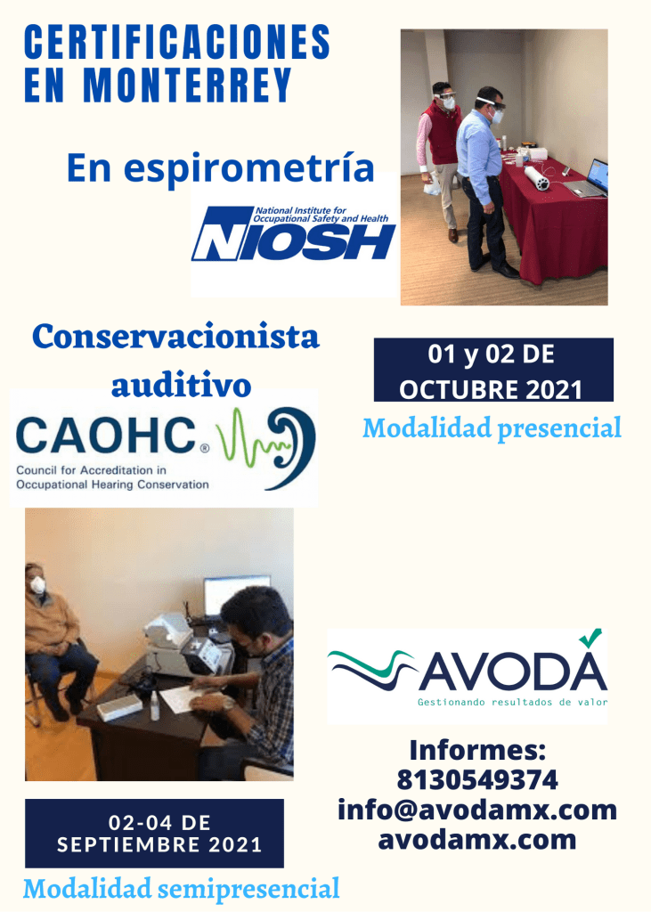 En septiembre y octubre de 2021 tendremos nuestras certificaciones en espirometría avalada por NIOSH (The National Institute for Occupational Safety and Health) (Modalidad presencial) y la certificación como conservacionista auditivo avalada por CAOHC (modalidad semipresencial)